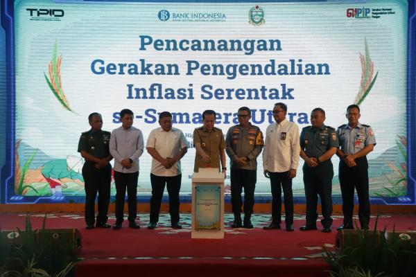 Medan. Penjabat (Pj) Gubernur Sumatera Utara (Sumut) Agus Fatoni bersama Forum Koordinasi Pimpinan Daerah (Forkopimda) melaunching Gerakan Penanganan Inflasi Serentak se-Sumut sebagai bentuk nyata komitmen percepatan penanganan inflasi. Kegiatan ini berlangsung di di Aula Tengku
