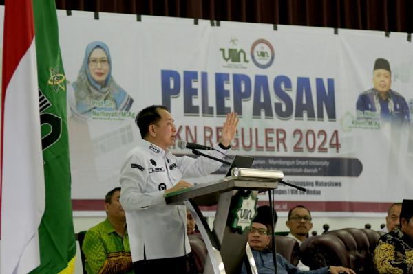 Medan. Penjabat (Pj) Gubernur Sumatera Utara (Sumut) Agus Fatoni melepas keberangkatan 5.500 mahasiswa Universitas Islam Negeri Sumut (UINSU) melaksanakan Kuliah Kerja Nyata (KKN). Kegiatan tersebut dilaksanakan di Kampus 1 UINSU, Medan, Sumatera Utara, Rabu (24/7/2024).
