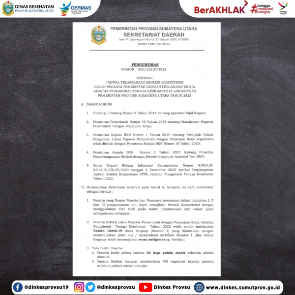 Berikut kami sampaikan melalui Pengumuman Jadwal Pelaksanaan Seleksi Kompetensi Calon Pegawai Pemerintah dengan Perjanjian Kerja Jabatan Fungsional Kesehatan di Lingkungan Pemerintah Provinsi Sumatera Utara Tahun 2022 yang tertulis dalam Pengumuman Sekretariat Daerah Provinsi Sumatera Utara Nomor : 800/15210/2022