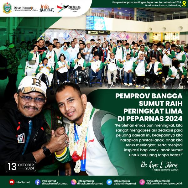 Pemerintah Provinsi (Pemprov) bangga kontingen Sumatera Utara (Sumut) barhasil meraih peringkat lima pada Pekan Paralimpik Nasional (Peparnas) XVII tahun 2024 di Jawa Tengah (Jateng). Pada Peparnas kali ini Sumut memperoleh 73 medali, yaitu 28 emas,