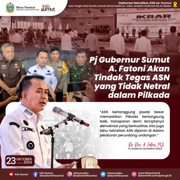 MEDAN - Penjabat (Pj) Gubernur Sumatera Utara (Sumut) Agus Fatoni menyampaikan akan memberikan tindakan tegas kepada Aparatur Sipil Negara (ASN) yang tidak netral dalam Pemilihan Kepala Daerah (Pilkada) serentak tahun 2024.
