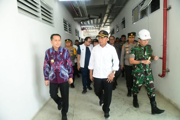 Deli Serdang. Penjabat (Pj) Gubernur Sumatera Utara (Sumut) Agus Fatoni bersama Menteri Koordinator (Menko) Bidang Pembangunan Manusia dan Kebudayaan (PMK) Muhadjir Effendy meninjau pembangunan Stadion Utama Pekan Olahraga Nasional (PON) XXI di kawasan Sport Centre