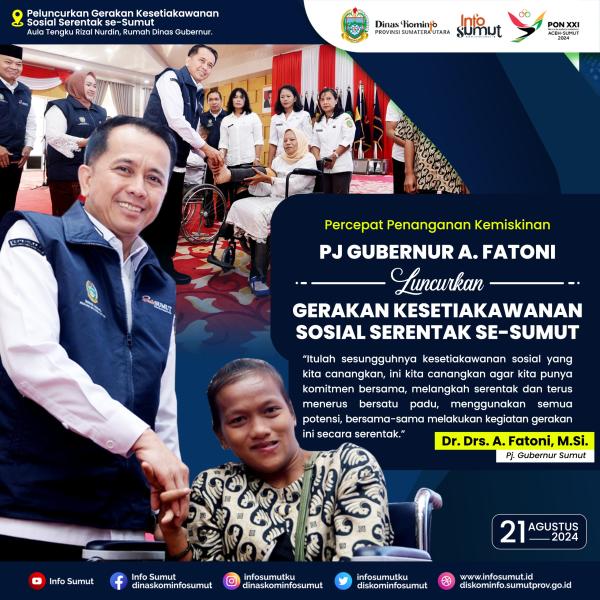 Medan. Penjabat (Pj) Gubernur Sumatera Utara (Sumut) Agus Fatoni meluncurkan Gerakan Kesetiakawanan Sosial Serentak se-Sumut. Kegiatan tersebut berlangsung di Aula Tengku Rizal Nurdin, Rumah Dinas Gubernur, Medan, Sumatera Utara, Rabu (21/8/2024).