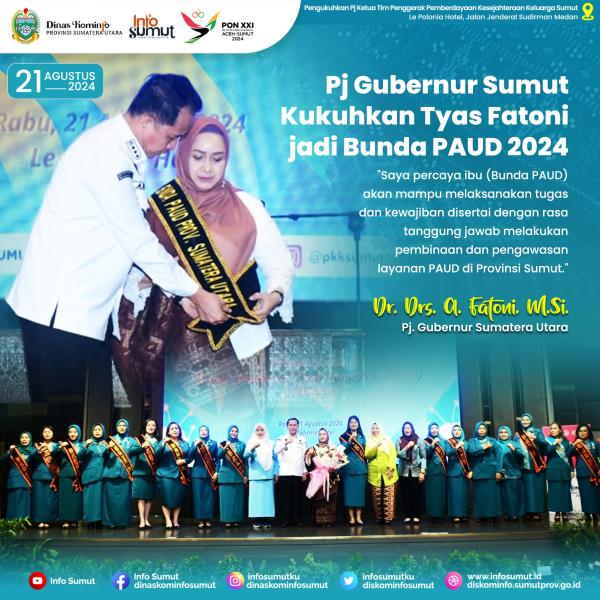 Medan. Penjabat (Pj) Gubernur Sumatera Utara (Sumut) Agus Fatoni mengukuhkan Pj Ketua Tim Penggerak Pemberdayaan Kesejahteraan Keluarga (TP PKK) Sumut Tyas Fatoni menjadi Bunda Pendidikan Anak Usia Dini (PAUD) Provinsi Sumut Tahun 2024. Kegiatan tersebut