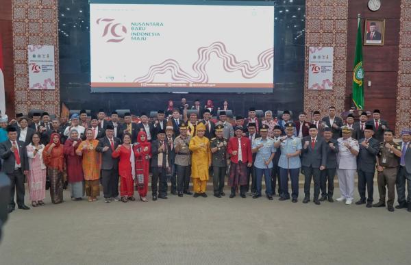 Medan. Penjabat (Pj) Gubernur Sumatera Utara (Sumut) Agus Fatoni bersama Forum Koordinasi Pimpinan Daerah (Forkopimda) menghadiri Sidang Paripurna Dewan Perwakilan Rakyat Daerah (DPRD) Sumut guna mendengarkan pidato kenegaraan Presiden Republik Indonesia (RI) Joko Widodo (Jokowi)
