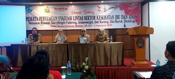 Medan.Dinas Kesehatan Provinsi Sumatera Utara menggelar Pertemuan Evaluasi Lintas Sektor Kesehatan Ibu dan Anak Termasuk Masalah Gizi (Weight Faltering, Underweight, Gizi Kurang, Gizi Buruk, Stunting) di Hotel Grand Antares Jalan Sisingamangaraja, Medan, pada 30 Juli