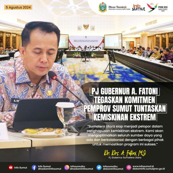 Jakarta. Penjabat (Pj) Gubernur Sumatera Utara (Sumut) Agus Fatoni menegaskan komitmen Pemerintah Provinsi (Pemprov) Sumut dalam mendukung penuh program Pemerintah Pusat guna menuntaskan kemiskinan ekstrem. Hal ini diungkapkannya dalam Rapat Koordinasi (Rakor) Regional Percepatan Penghapusan