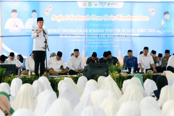 Langkat. Penjabat (Pj) Gubernur Sumatera Utara (Sumut) Agus Fatoni mengajak masyarakat yang ada di seluruh Kabupaten/Kota ikut menyemarakkan Pekan Olahraga Nasional (PON) yang akan diselenggarakan di Sumut. Hal itu disampaikannya saat Safari Dakwah dan Doa