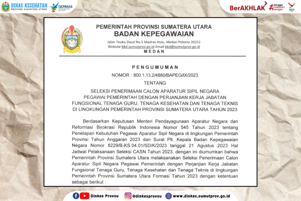 Pengumuman Seleksi Penerimaan Calon Aparatur Sipil Negara Pegawai Pemerintah dengan Perjanjian Kerja Jabatan Fungsional Tenaga Guru, Tenaga Kesehatan dan Tenaga Teknis di Lingkungan Pemerintah Provinsi Sumatera Utara Tahun 2023