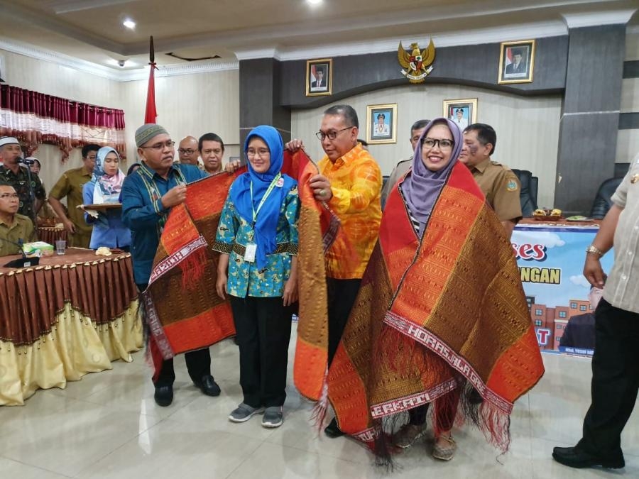 PADANG SIDIMPUAN : Tim Verifikator dari pusat melakukan verifikasi Kota Sehat di Kota Padang Sidimpuan disambut oleh Walikota Padang Sidimpuan dengan pemasangan ulos kepada Tim Verifikator,Rabu(07/082019)